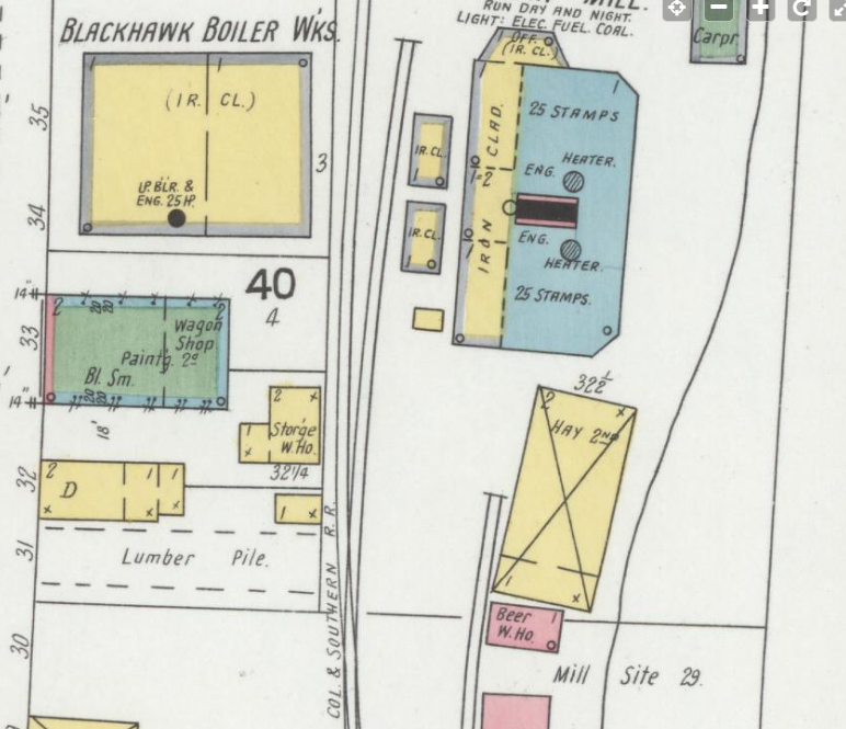 ![]() This is a detail of DPL x-2533, full image here: https://digital.denverlibrary.org/nodes/view/1123909?keywords=x-2533&type=all&highlights=WyJ4LTI1MzMiLCJ4Il0%3D&lsk=a587e794bc372a2ad5745b89ec0e0e6e The trusses were covered ultimately, I think during the 1890s. I'm not sure when they changed building numbers on Gregory in Blackhawk, your building at 141 Gregory was originally numbered 106 and 107 on the Sanborn maps 1900 and earlier. (Source Library of Congress)