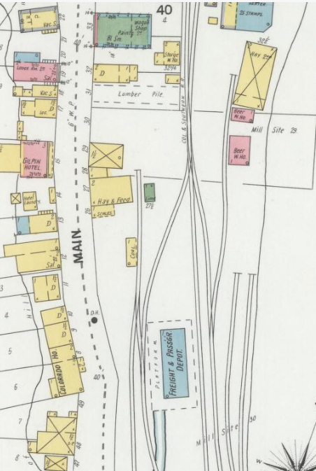 Interesting that is the first time I have heard the frame building across the street referred to as the office/ original for the Gilpin Hotel. In Sanborn maps it is listed as a residence. I wondered on its function in regards to the lumberyard that was next door as there was a fence between. I kind of wondered if the lumberyard was part of the hay grain business. I did not have room to do the hay grain building in my narrow space so I reluctantly omitted it. As a note the Hay Grain building was moved across the street when the Placer mining pit was dug in the depot/ lumberyard area and shows up in a pic that my Dad took in 1962 ![]() It is gone by 1975 (with a bonus pic of the front of the building in question.) ![]()