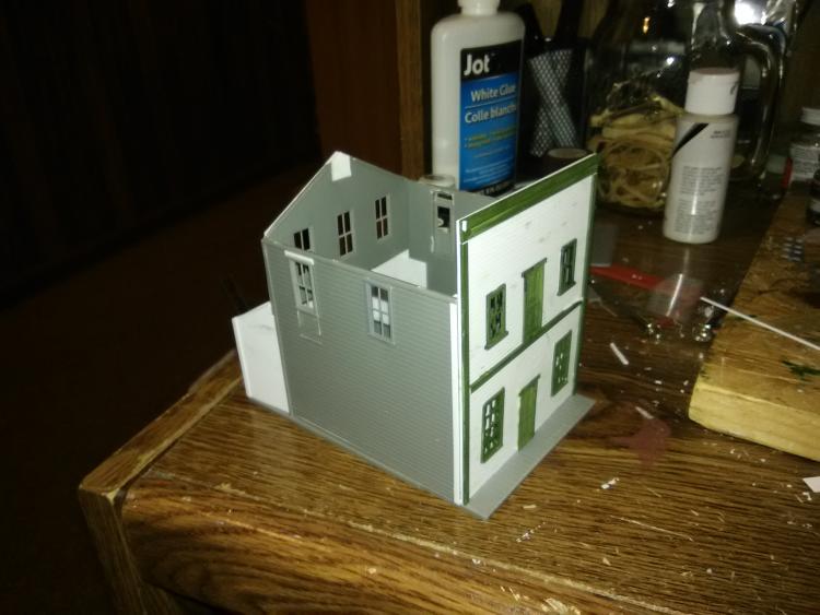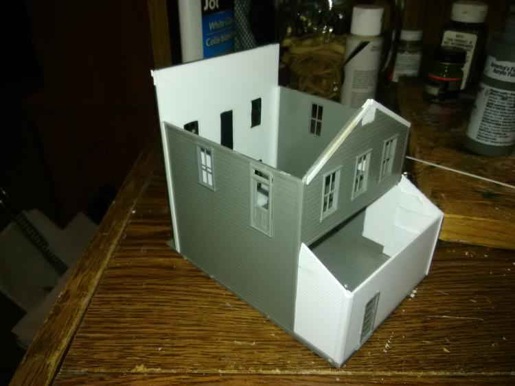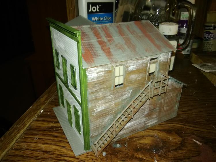 It may well be a separate one, knowing that it once was the hotel it might be a leftover. I suspect that the front once had a balcony too. Mine in HO is shorter especially in the lean to. ![]() It is a kitbash from a Grandt Line saloon kit. The sides were swapped and the front wall became the back wall. The new front wall was scratchbuilt along with the lean to. The old back wall wound up being a flat and I even used the storefront windows. ![]() ![]() ![]() ![]()