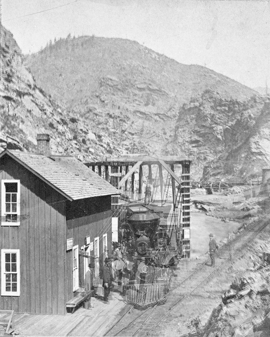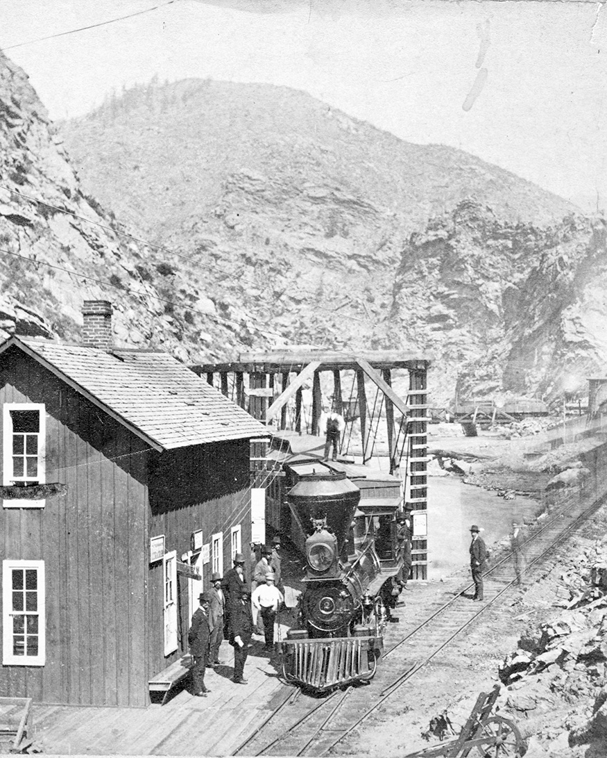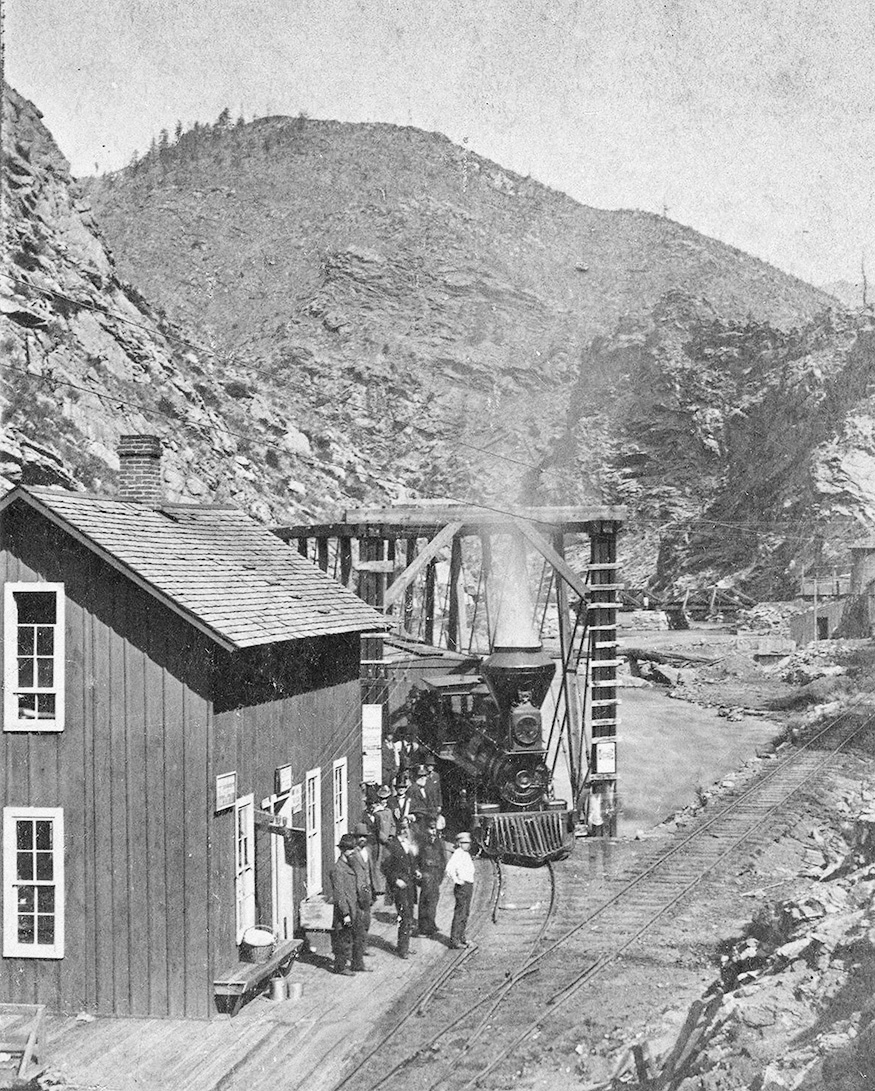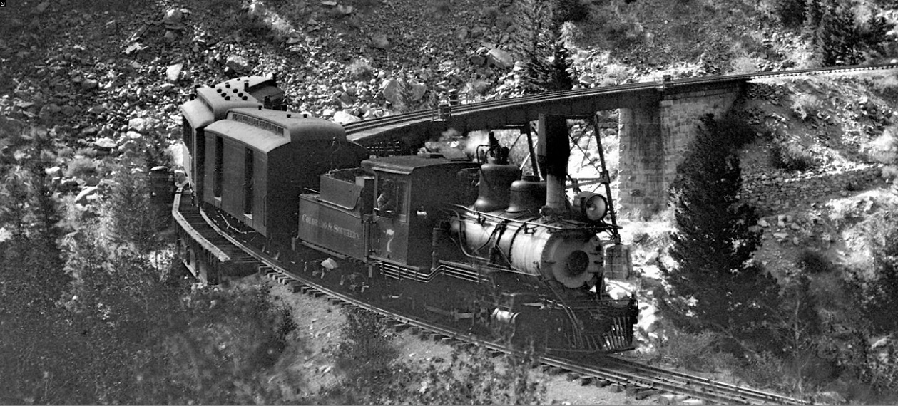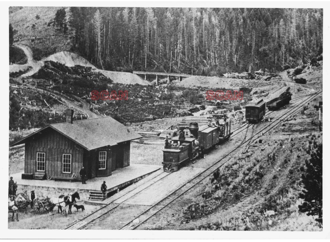 It is my understanding that the morning "down" train from Silver Plume had an early morning departure and arrived at Forks before the "up" train from Denver. The morning train down from Central and Blackhawk met the Silver Plume "down" train at Forks and cut in the baggage car and coach(es) from Central into the Denver bound morning "down" train. The locomotive then backed up to take water, perhaps coal, then turned around the wye, backed across the bridge, and went on the spot opposite the depot on the water tank leg of the wye. The morning "up' train from Denver was a long consist, including a baggage car and one or more coaches for Black Hawk / Central, usually required a helper from Denver to Forks. Arriving at Forks, the Central engine would cut out the consist for the Central branch, and would be on its way to Blackhawk. The shortened morning "up" train would then leave for Idaho Springs and eventually Silver Plume for a lunch lay over. The entire process would be repeated in the afternoon. If I were to guess the locomotive on the bridge, C&S 21, one of the rebuilt Brooks 2-6-0s, would be a good bet: \