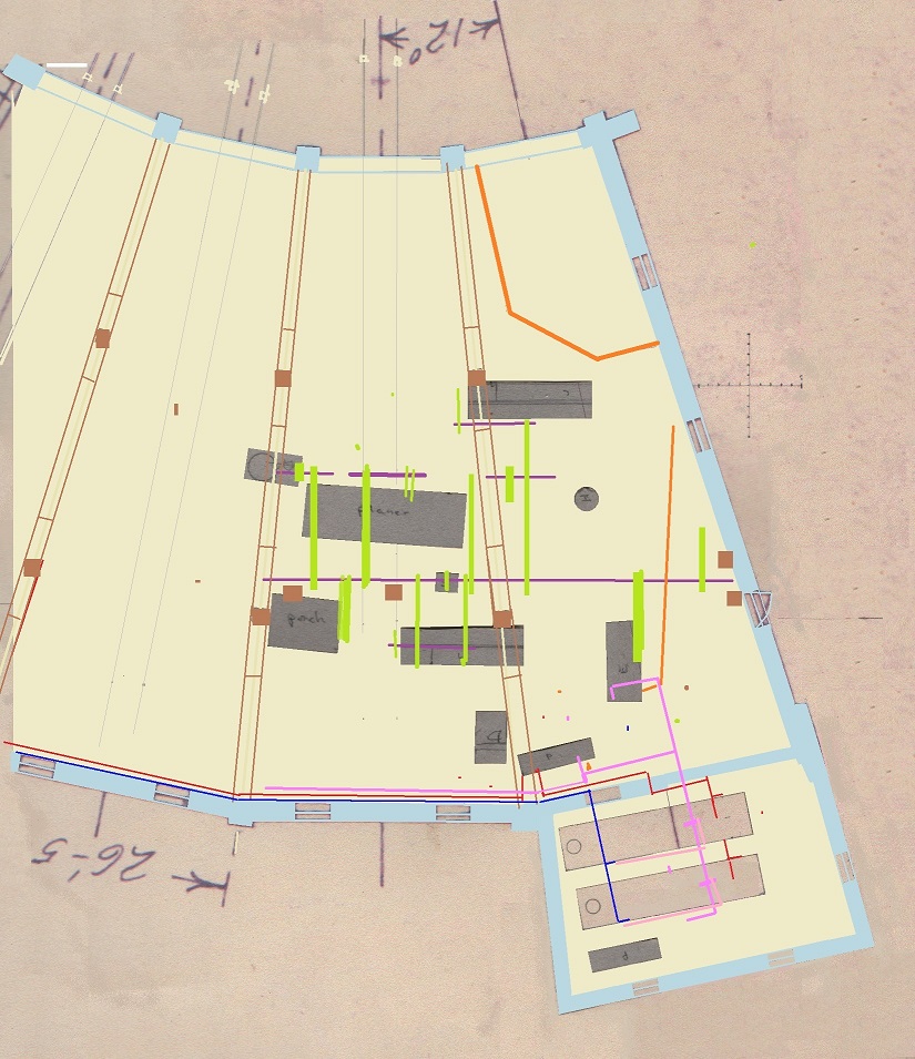 Jeff, please publish a key. I get that the walls are pale blue, and the brown squares appear to be wood columns. The grey squares are equipment (labels would help), and the boilers are obvious enough. Green are the belts and dark purple are the drive shafts. What are the pink, brown and blue pipes? And is the orange line an office at the front of the stall?