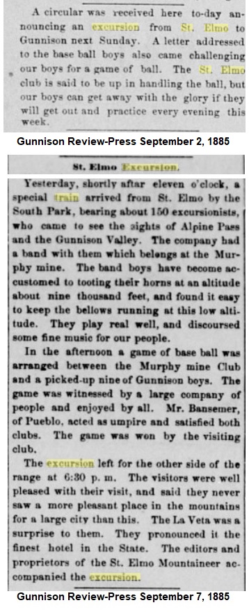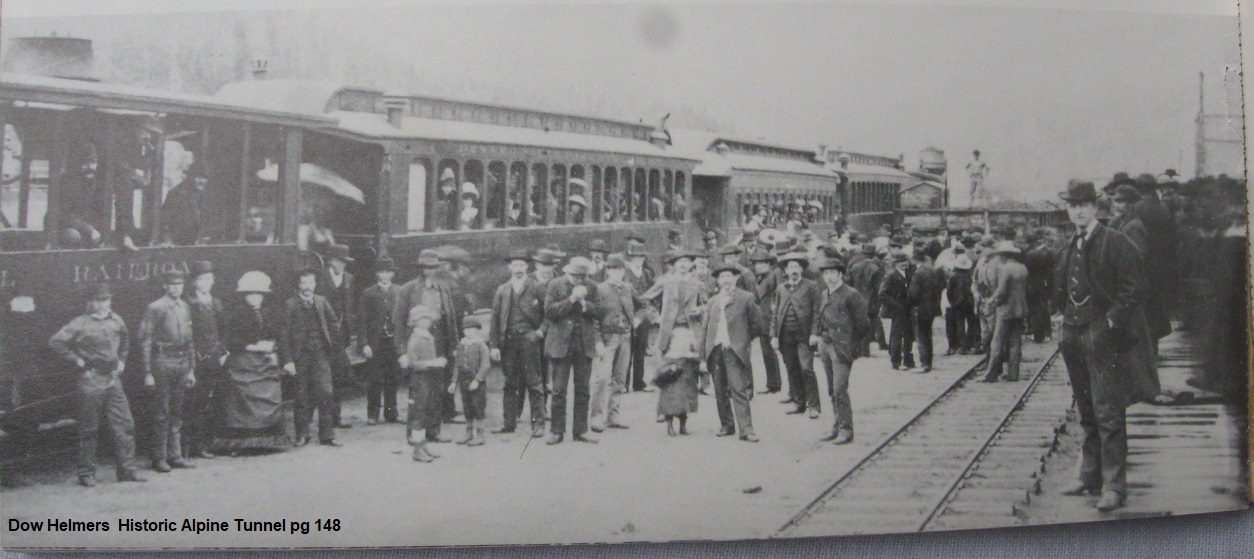 And still in use 4th July 1890 Idaho Springs, after the new open cars built in 1883. About that Flatcar musing of your's: The car usage brought up by Keith at Pitkin.....does raise another thought. ![]() Dow Helmers Historic Alpine Tunnel. ![]() ![]() If the DSP&P RR had their own, then why would they borrow/rent one from the CC in 1885 for this St Elmo group excursion to Gunnison....by UP directive? .......unless the DSP&P Dolly Varden (flat)cars had all been previously stripped for Freight service once the Company realised that they had no repetitive destination(s) for excursionists(unlike the CC RR)....... or, were shipped off to the U&N the year before...by UP directive? ![]() Whatever the reason, DSP&P must have lost a lot on deadheading that special train all the way to St Elmo, and back; maybe that's why we see no pictures of them West of Pine Grove, and after the t-o-c. Tundracamper sure has innocently opened a can of worms, and I thank him for that. ![]() A Lime Car? Yes, for lack of documentation, other than Mal's, proximity to the Kiln at the then end of track(extended sometime between Sept 1895 & April '98) that should be a Limecar, far too enclosed to be of an open Observation car. One could query that alone on the "spotted" location, I would think? Dave's photo in question is the X-11133 at the DPL. But I did find this, what possibly may be an Excursion car, suitably enclosed with canvas as temporary shelter following the Morrison fire of late June, 1890. CRRM Colorado Rail Annual No.12 ![]() The only question is whose car is that? ![]() Worms everywhere, I tell you!