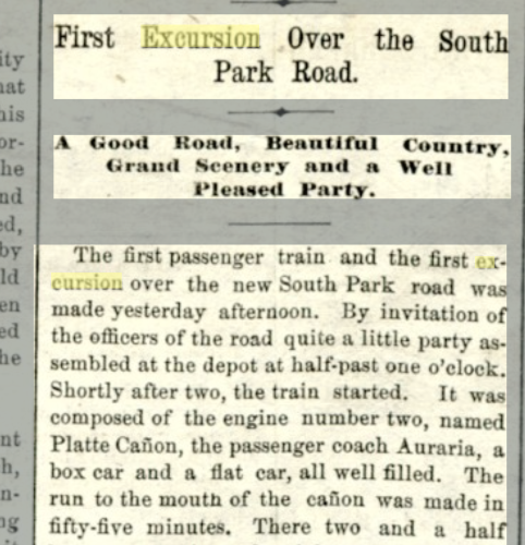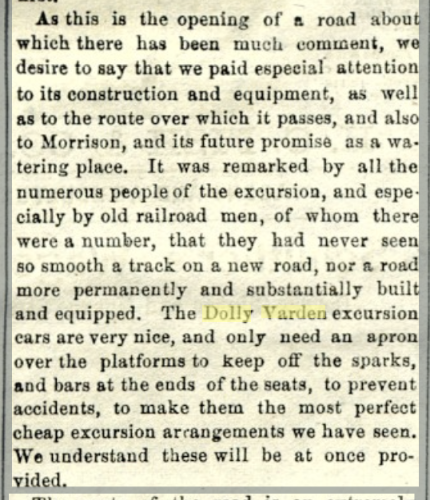 Nice one, Ron! Food for thought. Here's another from a couple months later, this snippet of a May 5 1878 Rocky Mountain News article: ![]() No excursion cars used. [Editing this to add another detail] I just found a June 27 1874 Rocky Mountain News article about the Dolly Varden cars. This could be read as something more substantial than a flatcar with removable superstructure but then it could be read as exactly that--the word "cheap" stands out.