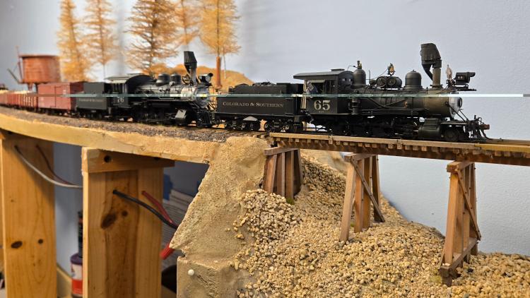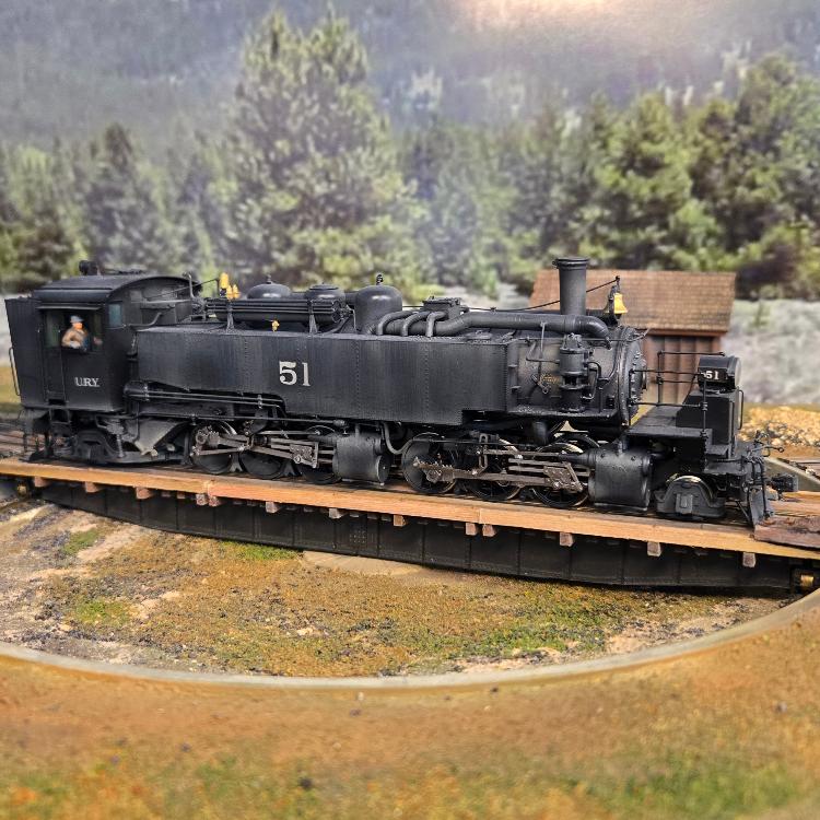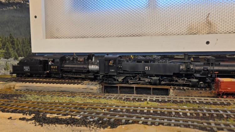 ![]() One of thee final requirements to be completed for my Electrical AP is the installation of the turntable and roundhouse. Long ago I purchased a Diamond turntable and an NYSE indexing system. Jack suggested I use a PSE DSX to manage reversing on the bridge. I built the roundhouse and turntable as a module and pulled this from the layout to wire the PSX, the various track leads and program the indexing system. Today, I installed the track connecting the leads to the turntable. And I got the soldering iron out to connect everything to the track bus. Whew! I turned on the track power and am able to run the 537 down the inbound track to the bridge, but now 5he bridge is not getting power. But I can turn the locomotive and the selected house track is live, so my to-do list is limited to getting power to the bridge. Stand by and enjoy this image of 76 and 65 double heading into Leadville. ![]()
