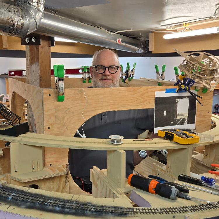 ![]() Track is almost above Kokomo. Once the track is in and tested, I can install the sub roadbed for the final, topmost circuit. ![]() My daughter stopped by today to hear me in the middle of the helix--This image gives you and idea about the scale of the enterprise. Kokomo will be where the tools are.