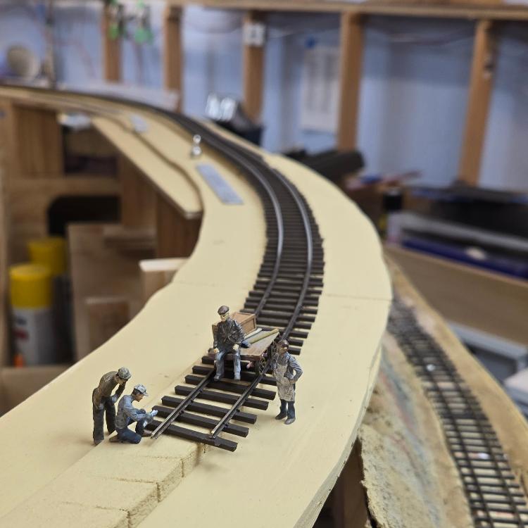 ![]() The roadbed is complete for a foll circuit. The grade ended up at about 1.5%, which is just fine. Next I need to plane/ sand the homabed sub roadbed to either flatten the cross sloping, or provide just a touch of super-elevation. This was the hard circuit, as there was a lot of cutting and measuring and re-cutting of the risers. The next circuit will be easier because I can rely on 1x4 spacers to get the job done. Yes, Jim, this will accommodate the Ridgeway spark arrestors.