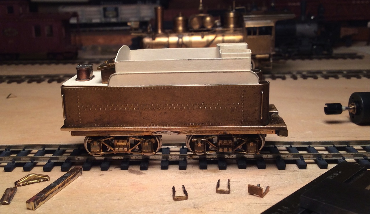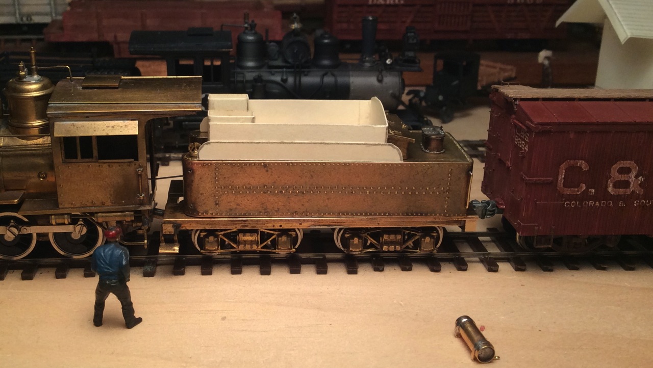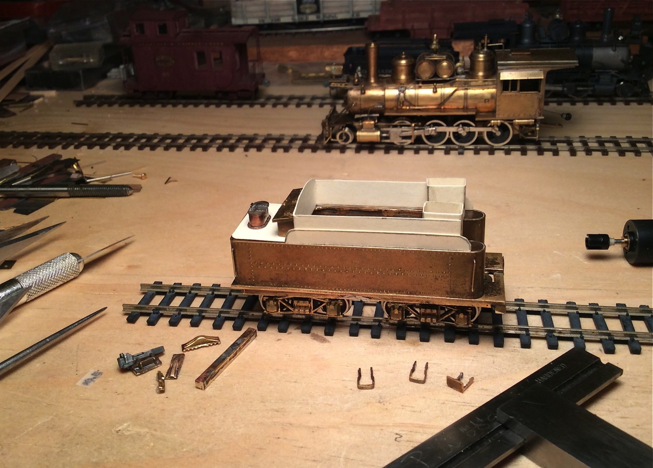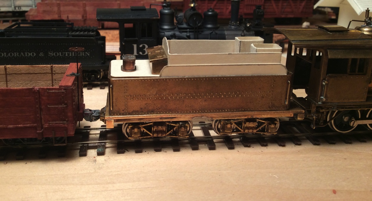 ![]() The cistern of the model is about 3" too long. I think I'll place the trucks at the correct distances from the ends, so that makes them about 3" too far apart. Here's a test assembly with the shortened frame, with the parts just stacked up on each other to see how it looks. ![]() ![]() I will remake the rear crossbeam (what's the right name for it?). Instead of using the straight one originally on the model that's sitting there in the foreground of the photo, it'll be deeper in the middle at the draft gear and tapering in depth out to the ends, as I see on various C&S tender photos. I borrowed a water hatch of roughly the right size, that I made 40 years ago for another tender, to see how the rear deck arrangement works out. The toolbox from the PFM model looks about right there-- I think? I'd be grateful for any comments/corrections at this stage. I think I might make the coal bunker 6" shorter, to leave the rear deck 5'6" instead of 5' as it is here. That would better match the tender on 59 in the Central City photo, I believe. So, all comments/thoughts/corrections eagerly solicited at this stage before I solder the frame back together and fabricate the top pieces. thanks! John