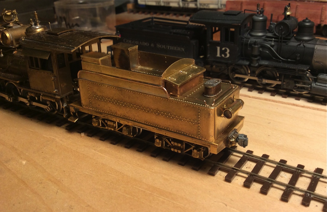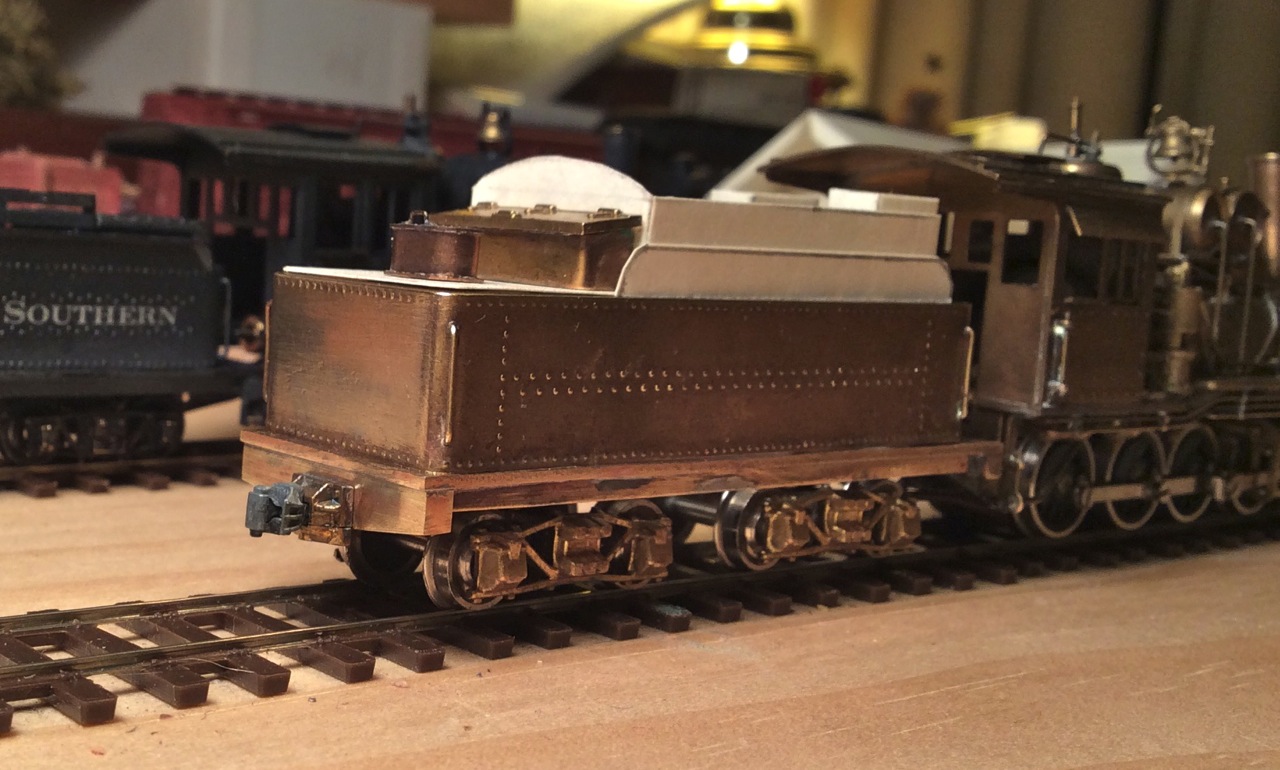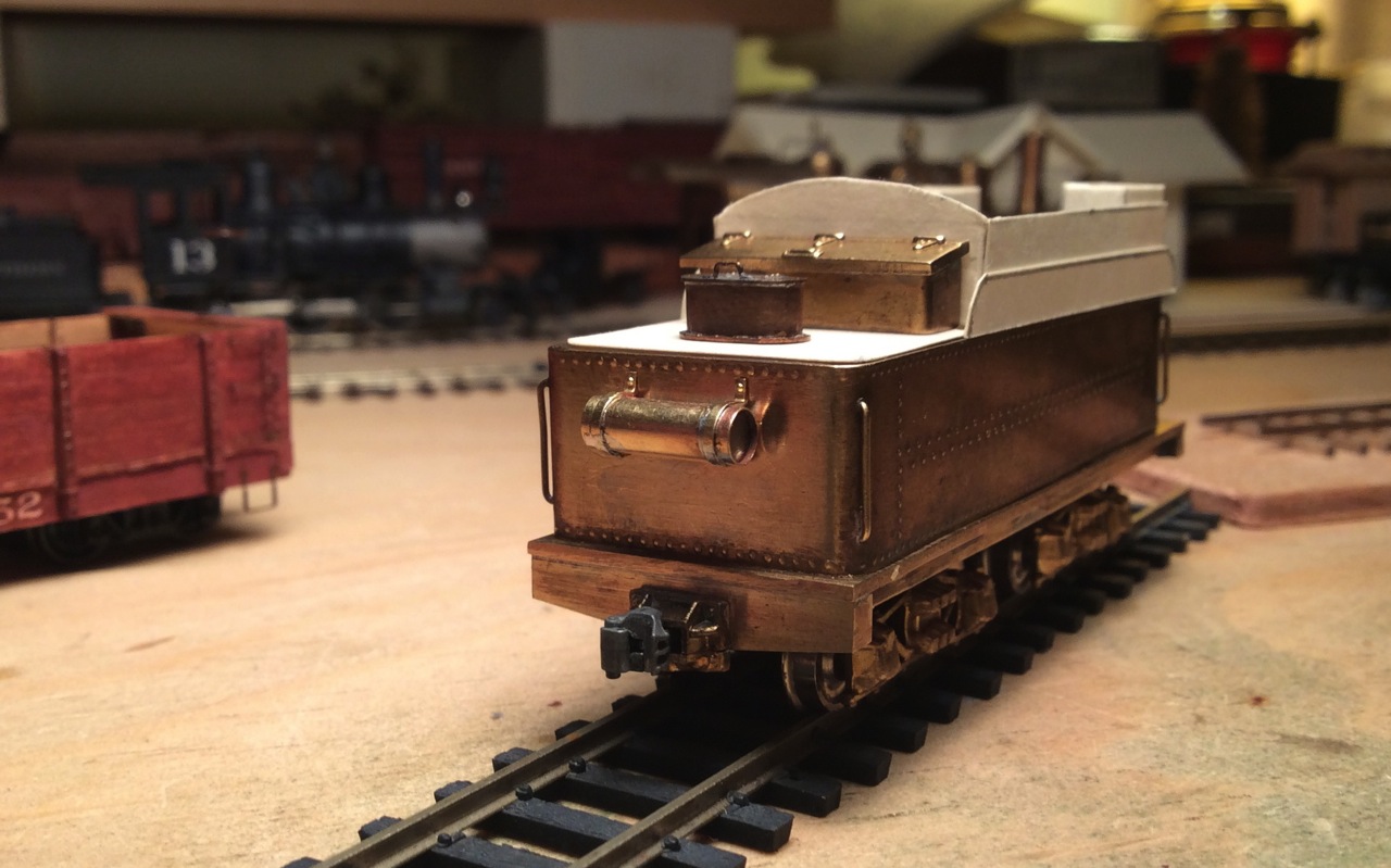 ![]() The cistern of the model is about 3" too long. I think I'll place the trucks at the correct distances from the ends, so that makes them about 3" too far apart. Here's a test assembly with the shortened frame, with the parts just stacked up on each other to see how it looks. ![]() ![]() I will remake the rear crossbeam (what's the right name for it?). Instead of using the straight one originally on the model that's sitting there in the foreground of the photo, it'll be deeper in the middle at the draft gear and tapering in depth out to the ends, as I see on various C&S tender photos. I borrowed a water hatch of roughly the right size, that I made 40 years ago for another tender, to see how the rear deck arrangement works out. The toolbox from the PFM model looks about right there-- I think? I'd be grateful for any comments/corrections at this stage. I think I might make the coal bunker 6" shorter, to leave the rear deck 5'6" instead of 5' as it is here. That would better match the tender on 59 in the Central City photo, I believe. So, all comments/thoughts/corrections eagerly solicited at this stage before I solder the frame back together and fabricate the top pieces. thanks! John