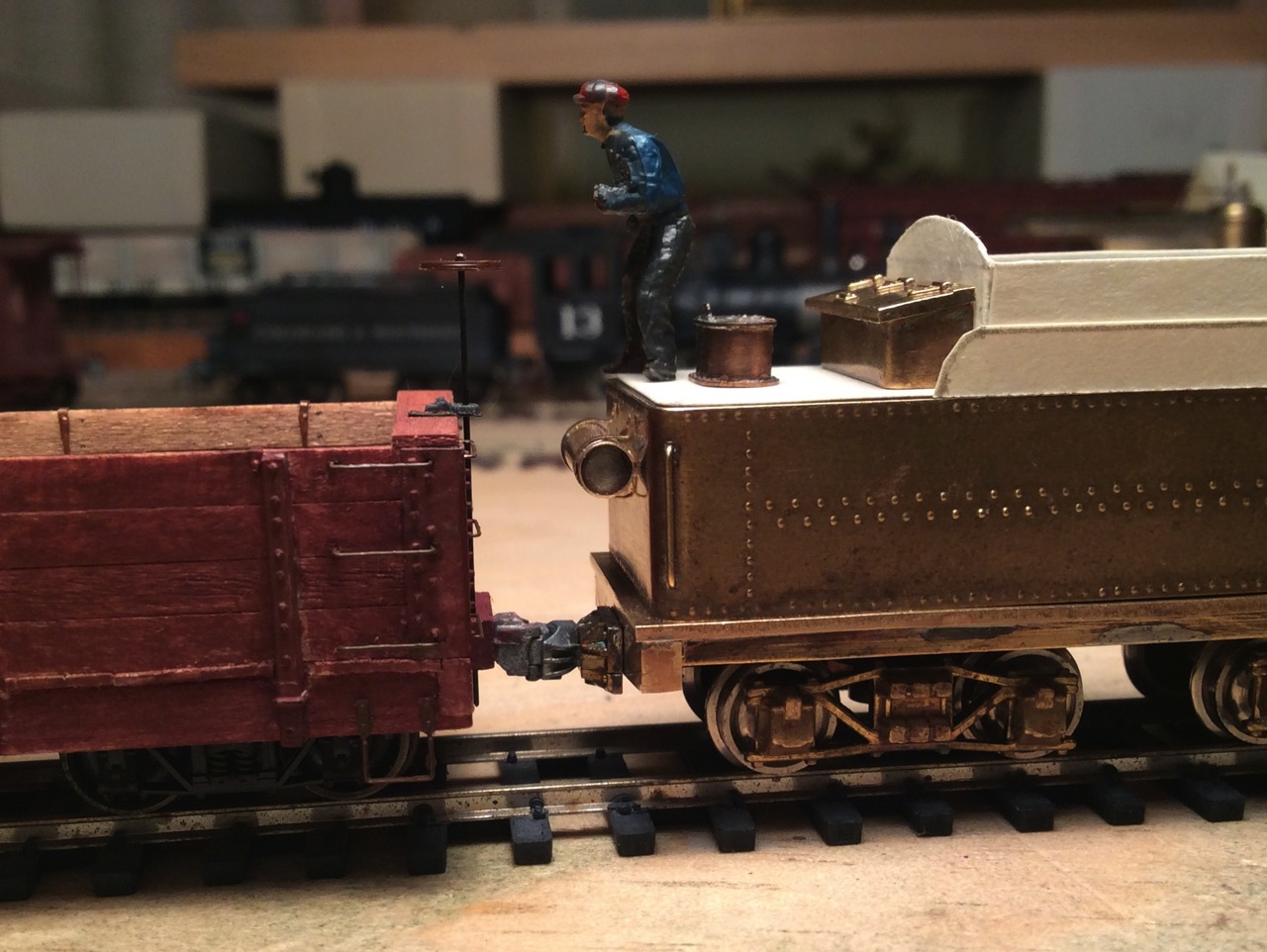 >Anyway, here goes... Don't worry at all about the tank resting so close to the end of the frame.you'll be fine with what you have, as long as you can get the cut lever brackets between the back of the cistern and the edge of the end beam. I'm not 100% on dimensions of the rear tank in those (your) days, but in later days, your air tank would be 12" in diameter, 33" or 36" long, and would have a triple valve on it with a small pipe with a controller at the front of the bunker side on the engineers side. In your days, there may not have been a retainer used, so that valve and pipe may not have been present. The air tank may also have been centered, not shifted to the right as it was in later times. >There were almost certainly three grabirons at the rear deck (water hatch) around the end and sides, for safety. There were probably marker light brackets at the corners. #7, in 1899 still carried DSP&P style cage lamp holders in the corners so that has been around forever. I'm sure there were grabirons on both sides of the end beam as well. Not sure about rerail frogs... >Also, don't forget the water valves at the front of the water legs, at the front of the tool boxes that wouldn't have those wind screens yet. >Mike Hi Mike, many thanks for this information!! As you noticed in the last photo I posted, there is only 4" of frame deck projecting beyond the back end of the cistern. I think photos show that some frames were about like that, though some were definitely a few inches longer, but I think this does give me enough room for the cut lever brackets. By the way, I'm still wondering-- do you know why the original, long rear frame decks disappeared on the later tenders? Could it have had anything to do with safety? I'm thinking about this comparison: ![]() ![]() Maybe some of you with real railroad experience could say if one of these is easier to climb across than the other (if the grabirons, stirrup steps, and the air tank were in place on the new one)? Or was there some entirely different reason for eliminating the back frame deck? Anyway, Mike, the grabiron positions you describe will be the ones I'll do. Every photo I've found of the intermediate and modern tenders shows the three long grabirons around the edges of the back deck, and likewise all that are visible do have a grabiron on each side of the end beam, just as you say. I don't have a good photo of the back end of a tender from my 1918-ish time frame, so I'm relying on later photos. I hadn't noticed that the air tanks were to right of center- I'll have to look for that. I think I saw a photo from around my time with a retainer valve on the engineer's side, and I will put one on the model. As to the air tank, I'll use your dimensions. Definitely will have the marker lamp brackets at the back corners, yes, a real C&S thing. Rerail frogs weren't always there, but I see the (empty) brackets for them in some photos, so I'll put them on. I've bought some very nice water valve castings from Wiseman, they'll look good! again many thanks for your help and encouragement! and thanks, Keith! John