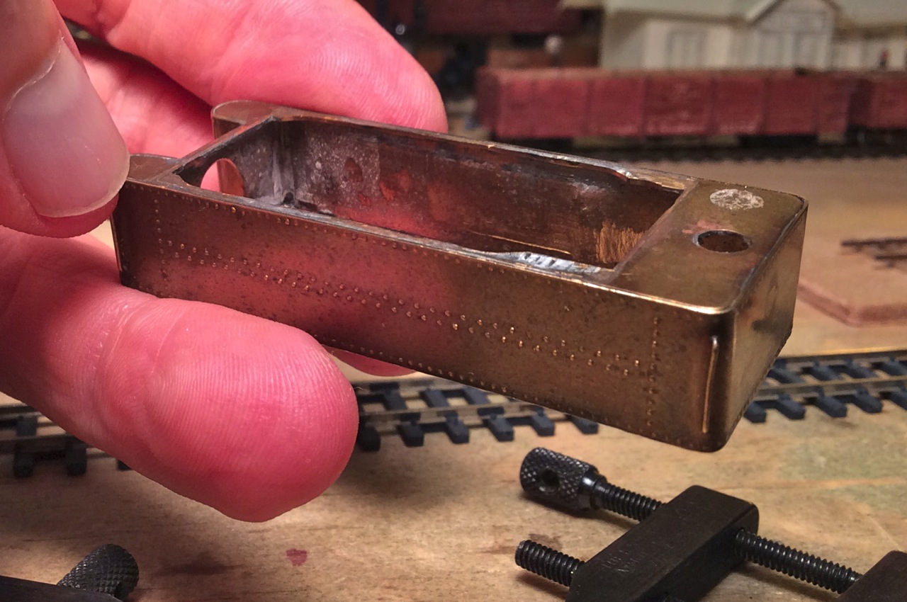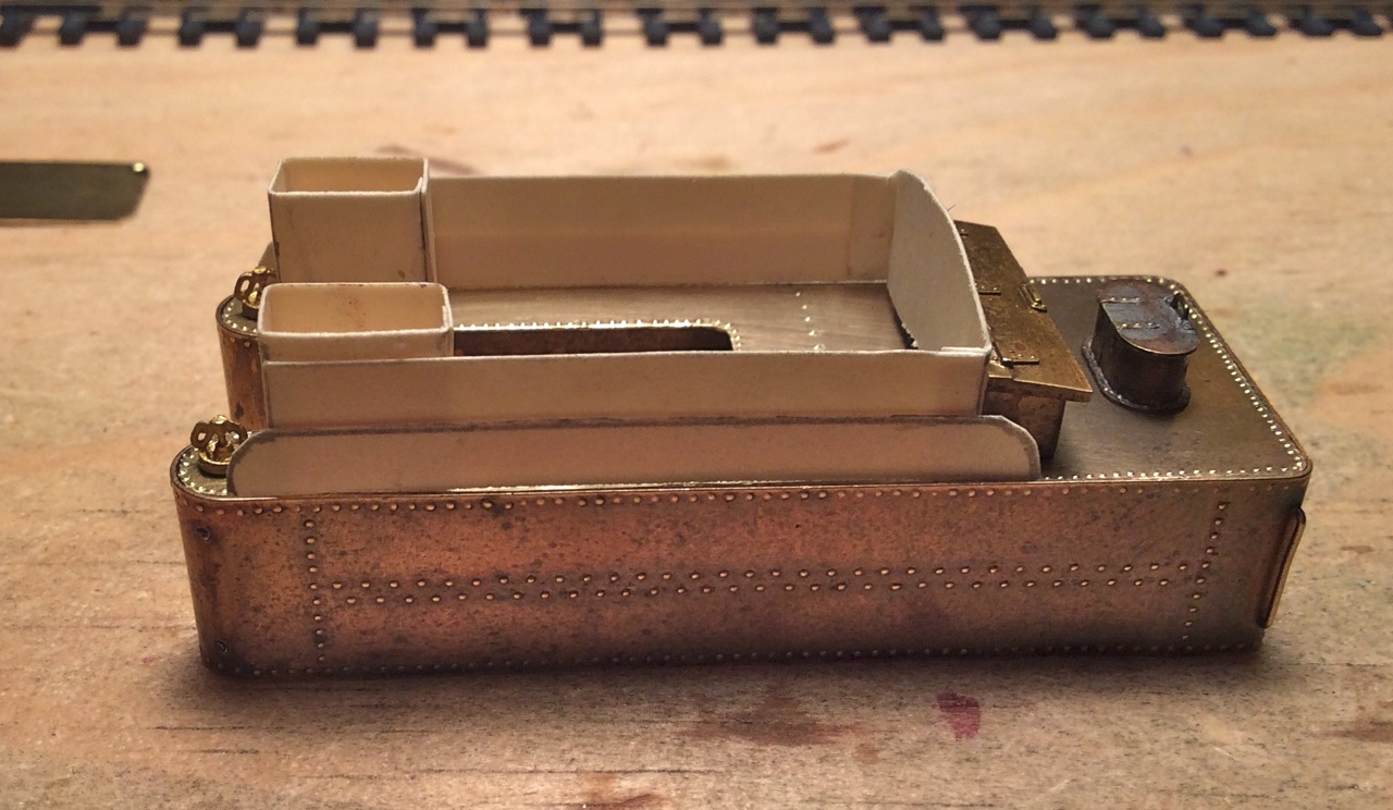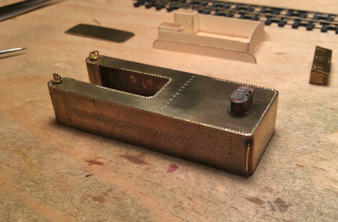 Here's what remained of the original PFM tender cistern: ![]() After taking off the old parts, here it is with the new top set in place for a test fit: ![]() Being a lazy riveter, I only used rivets in where they would be visible:
